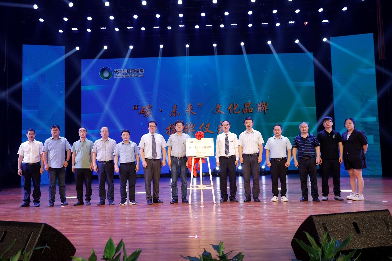单胜道与企业嘉宾、学校相关部门负责人、环资学院班子共同为“碳·未来”文化品牌揭牌。