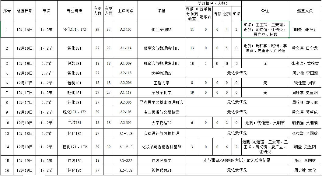 周一概率论与数理统计》课程,吴阿林老师,老师提前15分钟到教室,所授理论内容和实际较为贴合,轻化18同学的就坐较为集中,听课氛围整体良少数同学存在不专心现象。《化工原理》课程,刘宝鉴老师,老师提前15分钟到教室,所授理论内容和实际较为贴合,轻化17同学的就坐较为集中,听课氛围好少数同学存在分神现象。