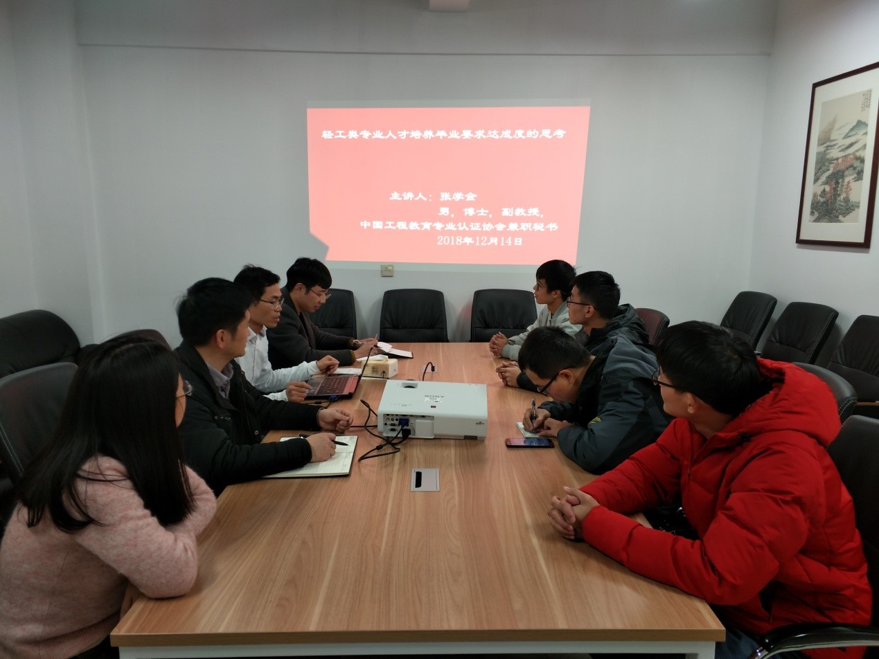 2018年12月14日,环资学院张学金副教授在环资学院会议室609室进行了主题为“轻工类专业人才培养毕业要求达成度的思考”的报告,胡志军副院长、轻化工程系的老师及同学参加了本次活动。